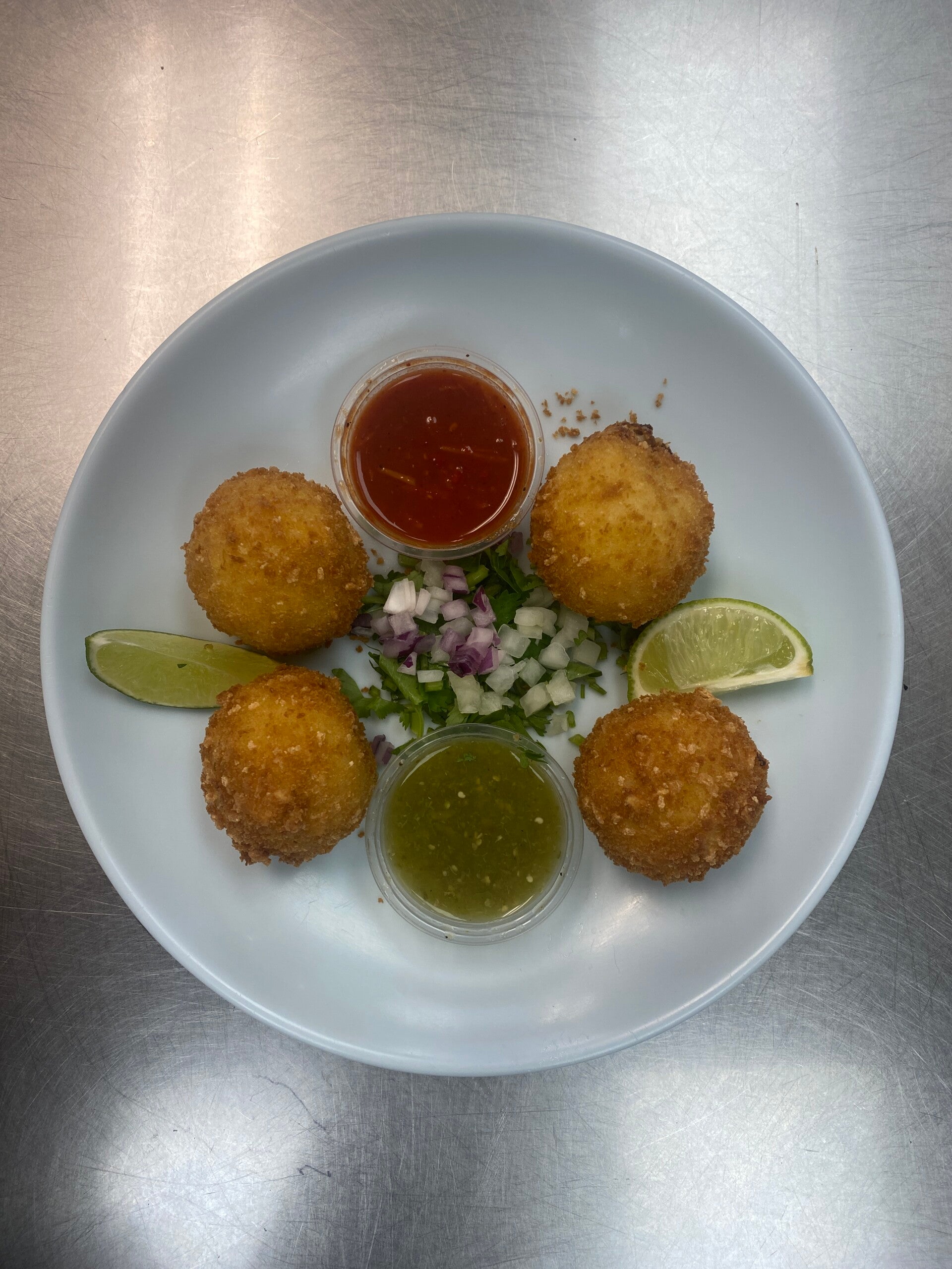 Four fried taquitos chicken or potato topped with lettuce, queso fresco, sour cream & guacamole. Plate served with rice and refried pinto beans.